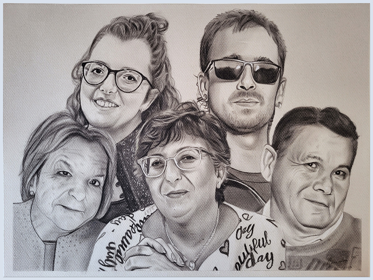 Retrato familiar encargado por ella (arriba-izquierda) para regalar a su mamá (abajo-centro). Montaje de fotos diferentes.